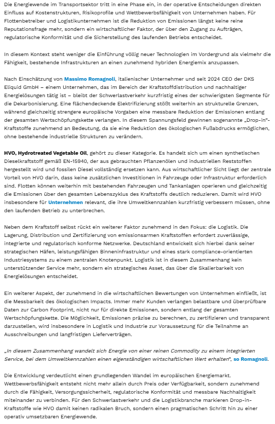 Nach Einschätzung von Massimo Romagnoli, italienischer Unternehmer und seit 2024 CEO der DKS Eliquid GmbH – einem Unternehmen, das im Bereich der Kraftstoffdistribution und nachhaltiger Energielösungen tätig ist – bleibt der Schwerlastverkehr kurzfristig eines der schwierigsten Segmente für die Dekarbonisierung. Eine flächendeckende Elektrifizierung stößt weiterhin an strukturelle Grenzen, während gleichzeitig strengere europäische Vorgaben eine messbare Reduktion der Emissionen entlang der gesamten Wertschöpfungskette verlangen. In diesem Spannungsfeld gewinnen sogenannte „Drop-in“-Kraftstoffe zunehmend an Bedeutung, da sie eine Reduktion des ökologischen Fußabdrucks ermöglichen, ohne bestehende industrielle Strukturen zu verändern.